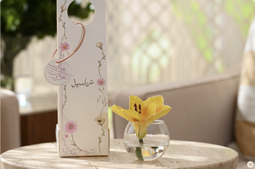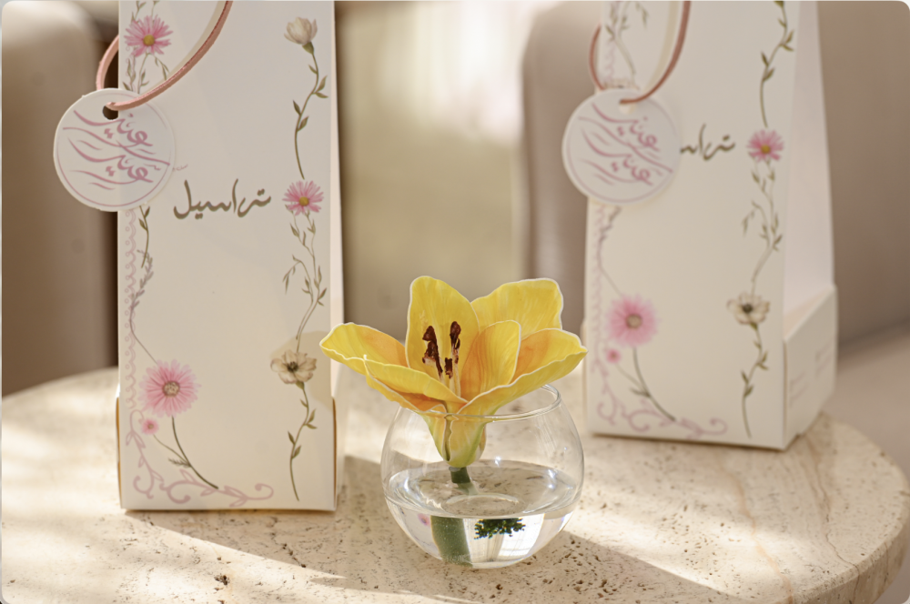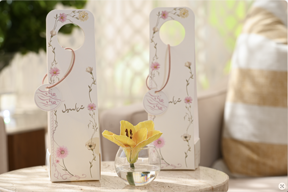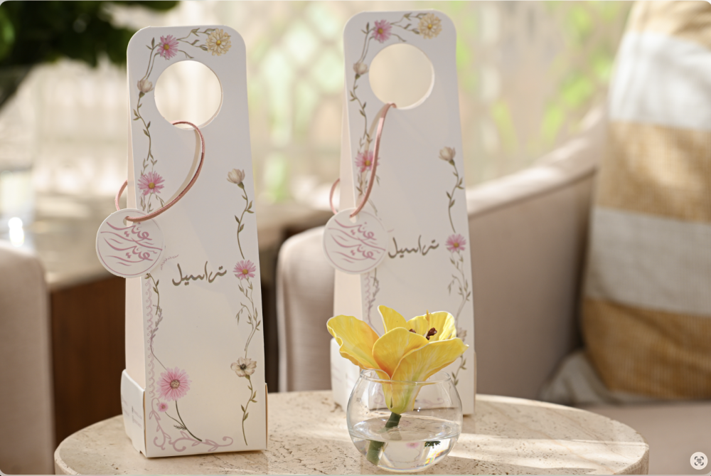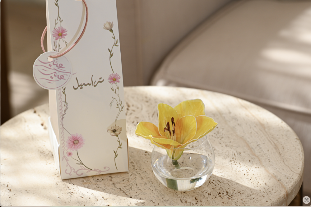 يأتي المنتج مع حامل ورقي مزخرف بنقوش زهرية ناعمة، مخصص لتوزيعات العيد، ومرفق بتاق أنيق يحمل عبارة “عيد سعيد”، ليجعلها هدية مثالية تعبّر عن الذوق والاهتمام بالتفاصيل.