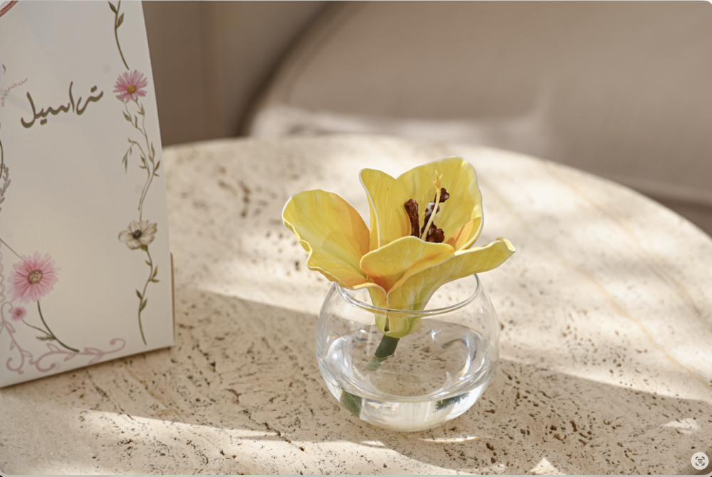 تتكون من ورد صناعي بلون وردي ناعم، مثبت داخل فازة زجاجية شفافة بمادة صلبة شبيهة بالماء، تمنحها مظهرًا طبيعيًا وأنيقًا دون الحاجة إلى أي عناية.