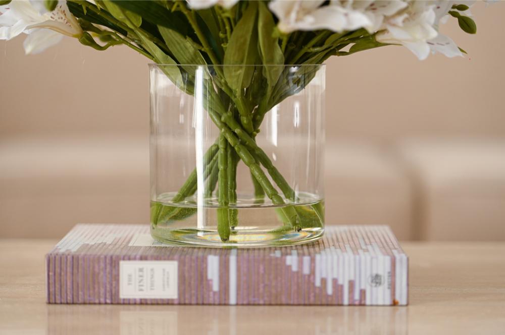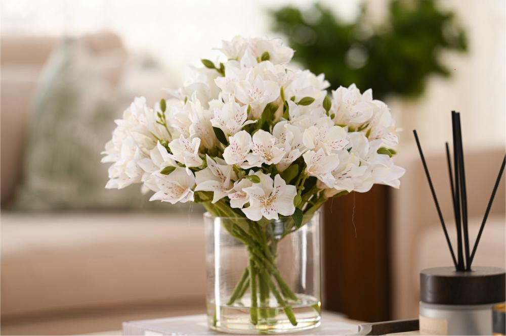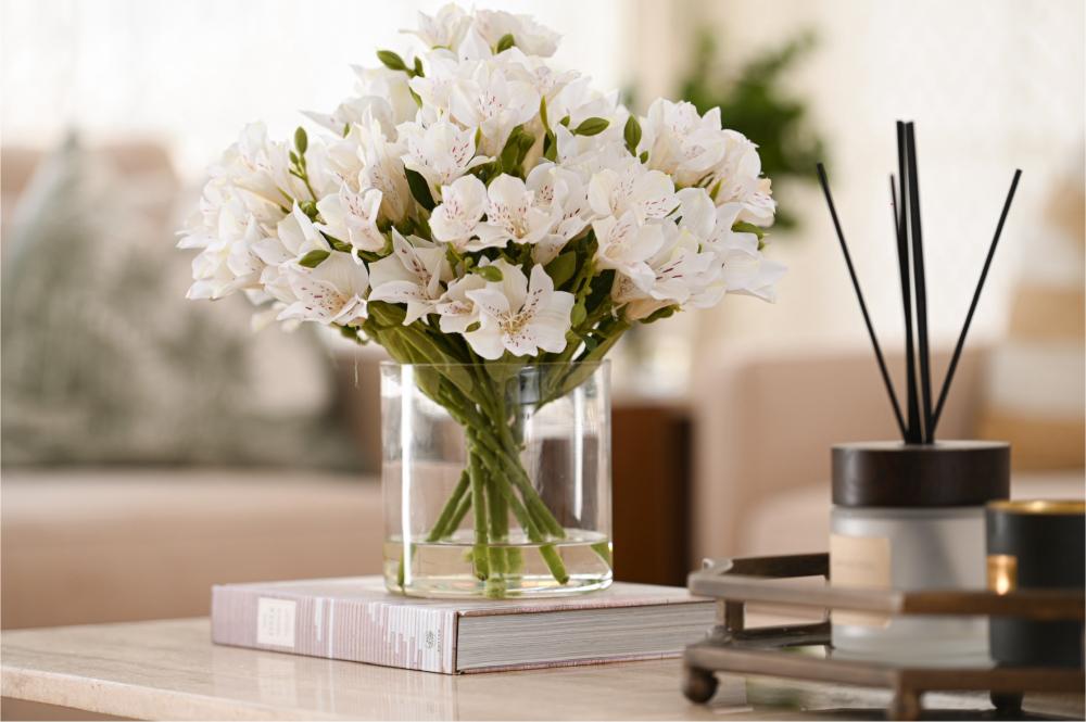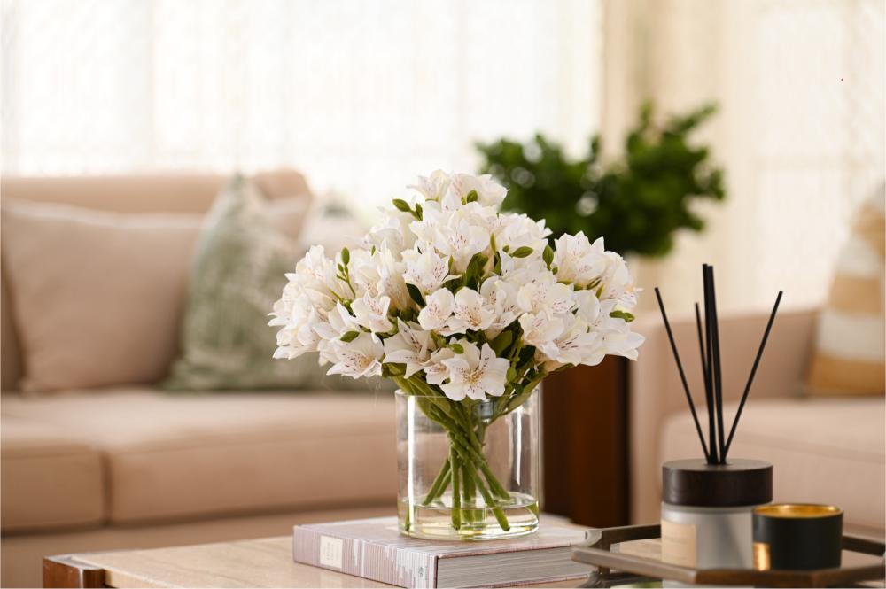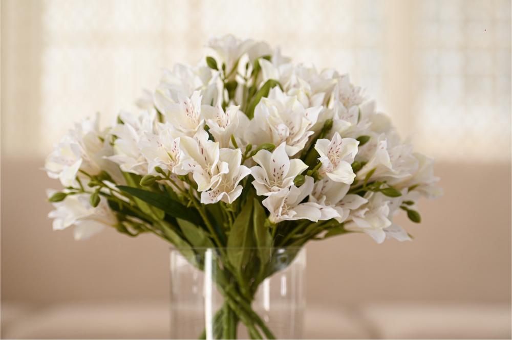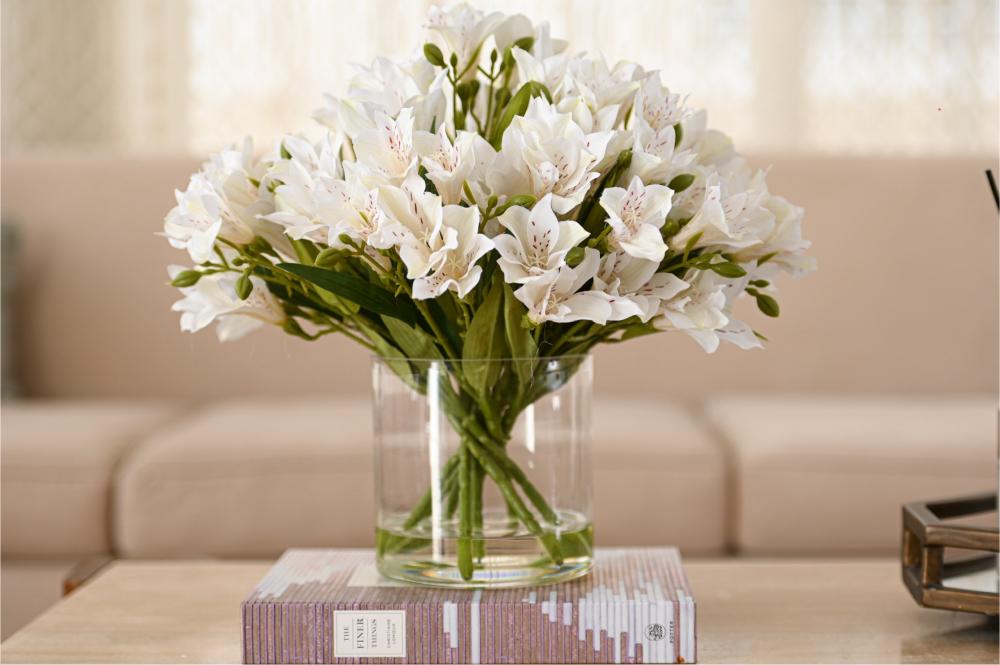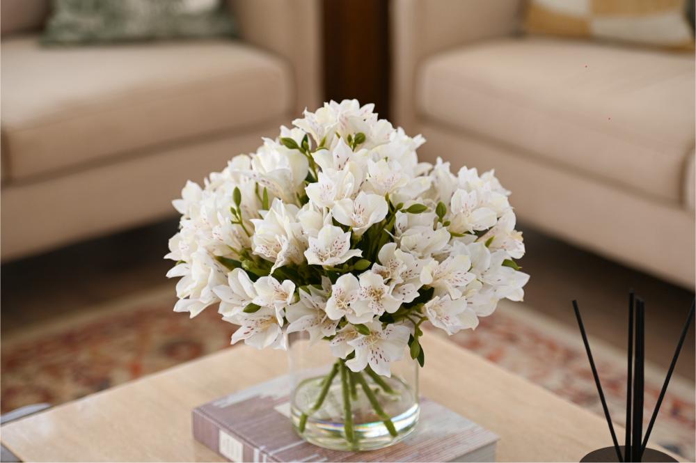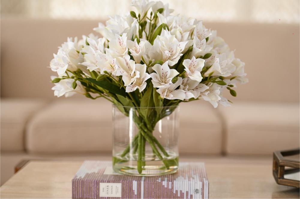 تنسيق راقٍ من زهور الألستروميريا البيضاء، يتميز بأناقته الهادئة وتفاصيله الناعمة التي تضيف لمسة فخامة طبيعية لأي مساحة. تم اختيار الورد بعناية ليعكس إحساس الصفاء والرقي، ومثبت داخل فازة شفافة بتصميم بسيط يبرز جمال السيقان وتناسق الترتيب.