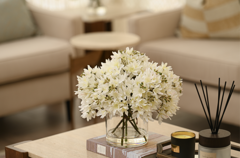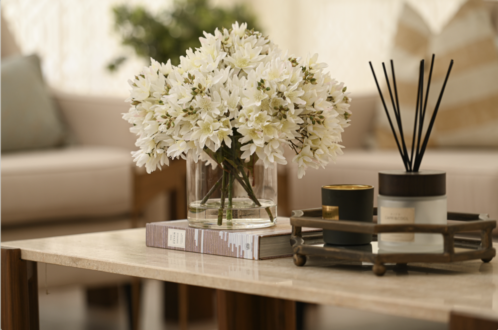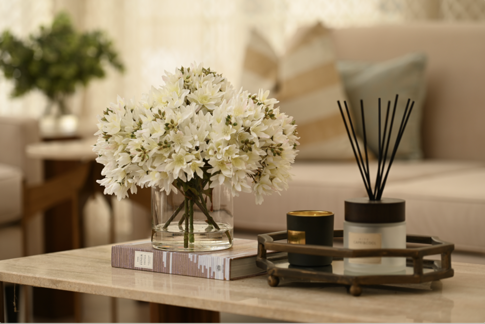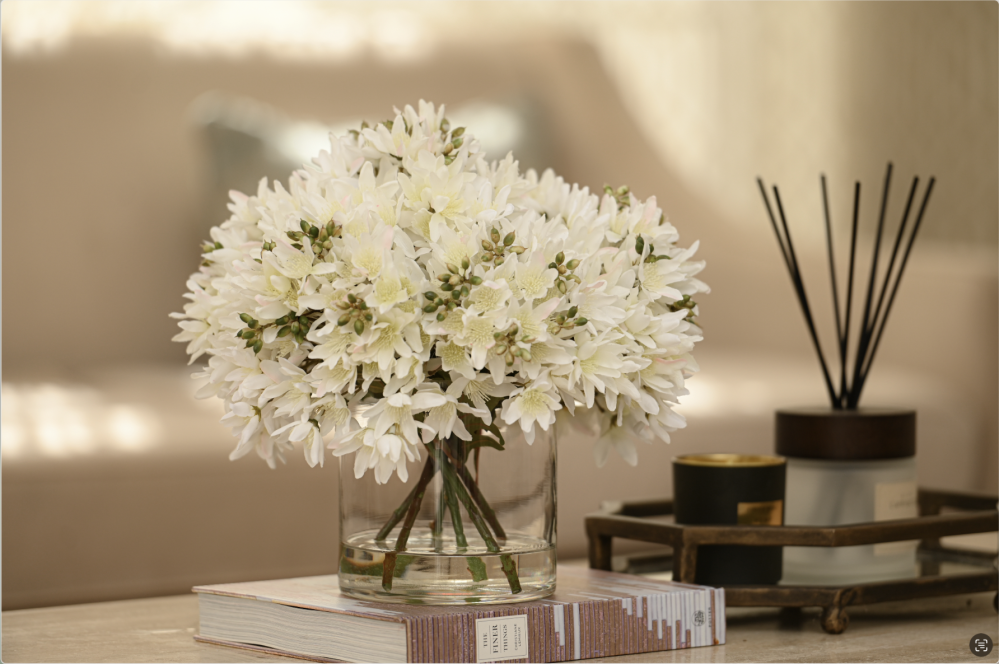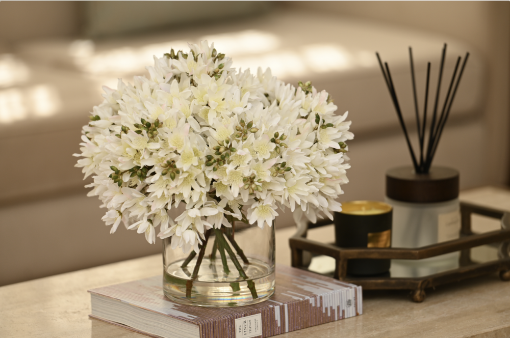 تنسيق ورد صناعي فاخر مستوحى من نقاء الألستروميريا البيضاء