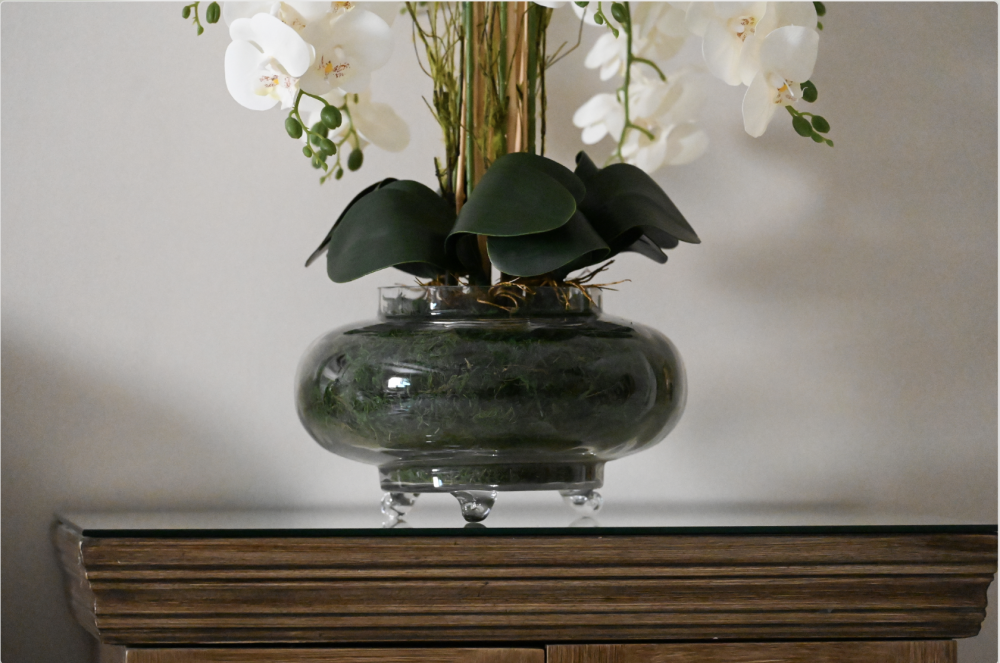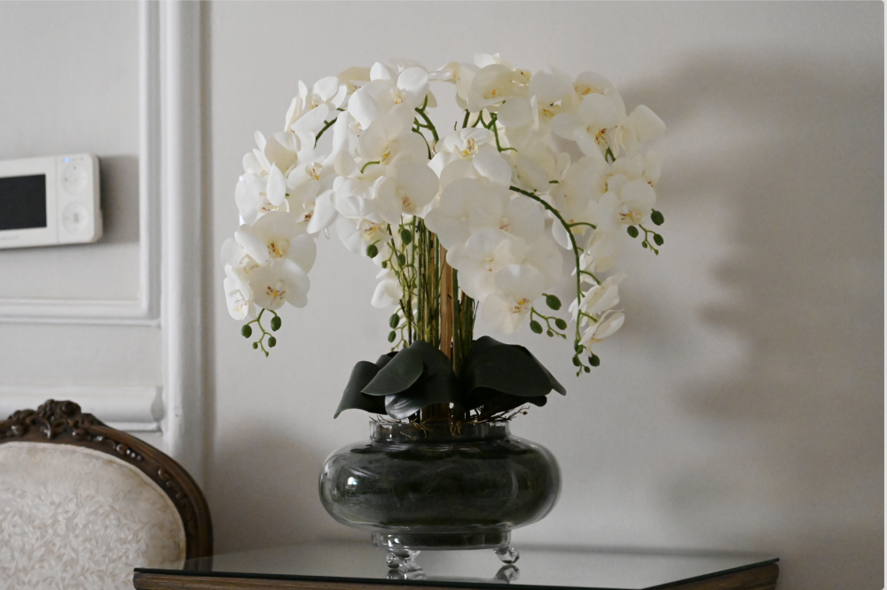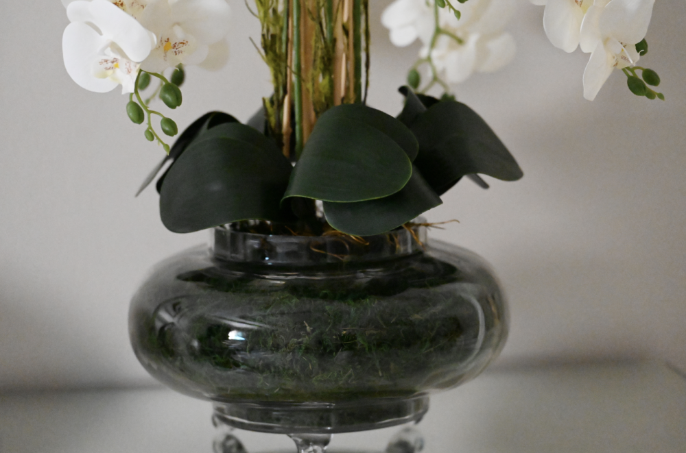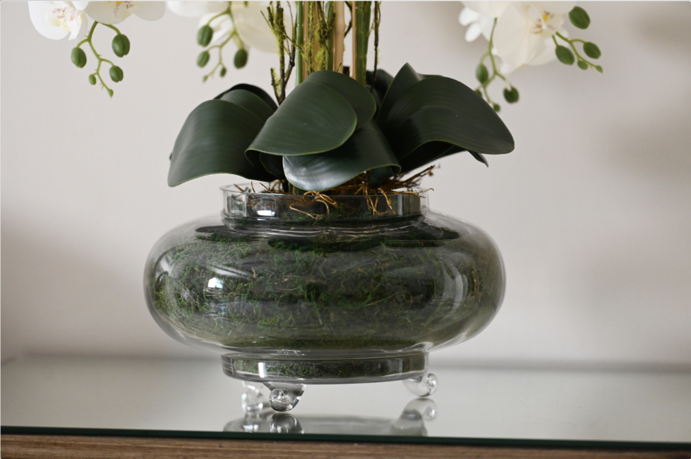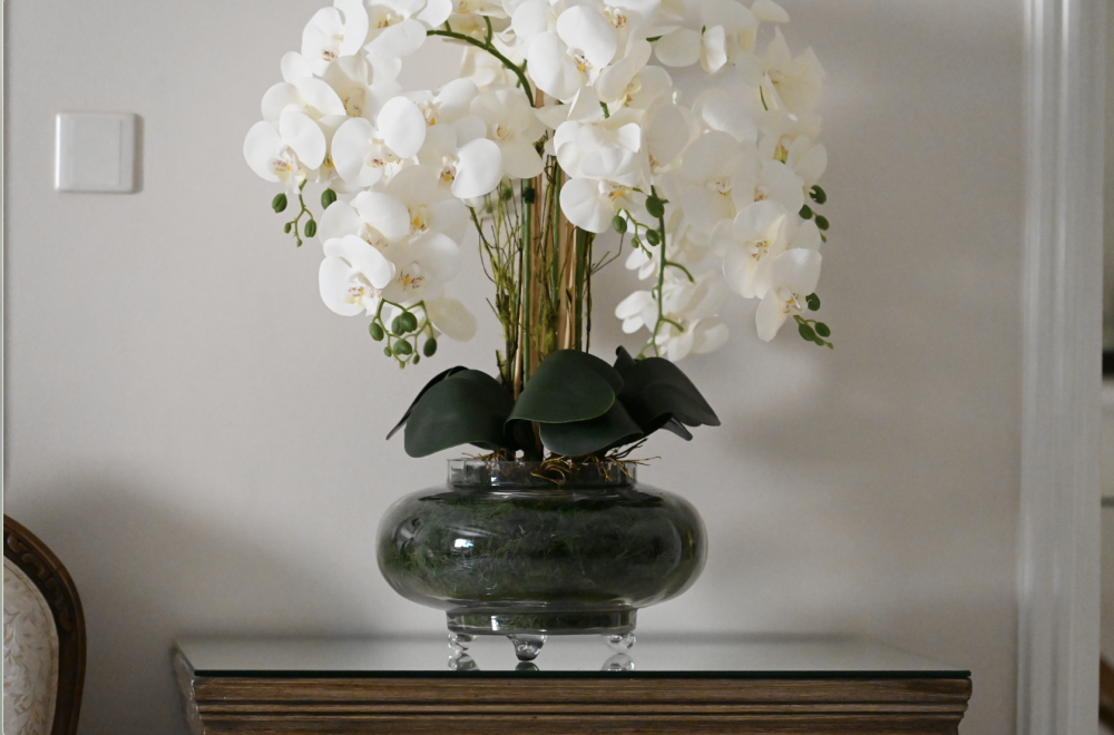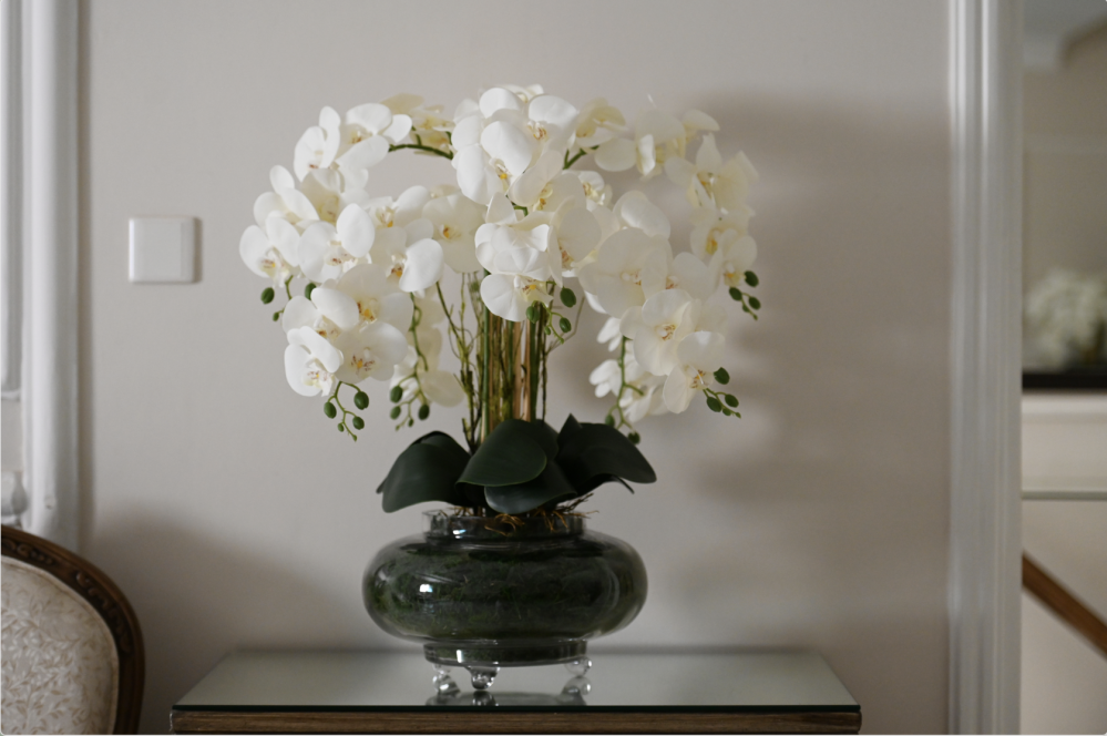 من أفخم و أرقى فازات الاوركيد حجمها كبير حيث يُضفي ورد الاوركيد لمسة جمالية على أجواء منزلك الرائع هذه الفازه تحتوي على ثمان اغصان ورد الاوركيد مزينة بأغصان خشبية وسطح القاعدة مزين بعشب طبيعي مجفف مع أوراق الاوركيد الخضراء.
