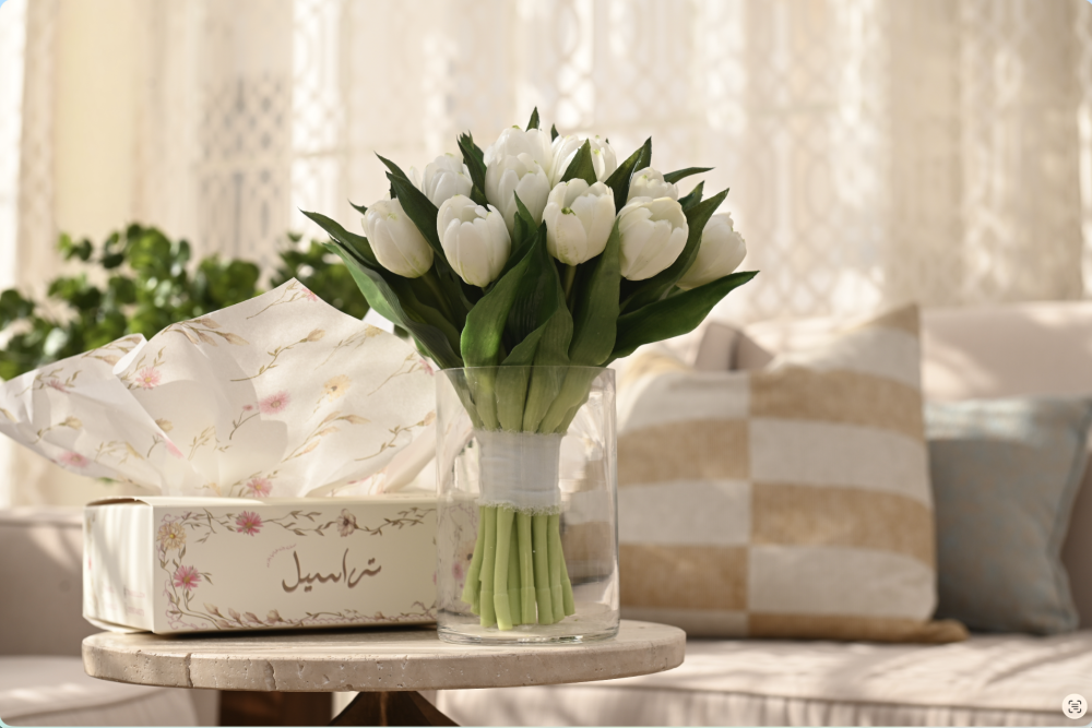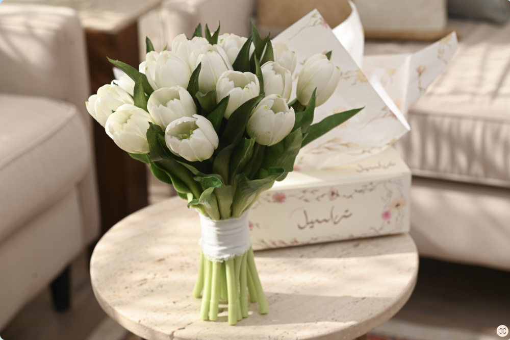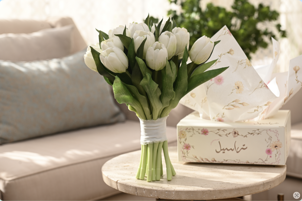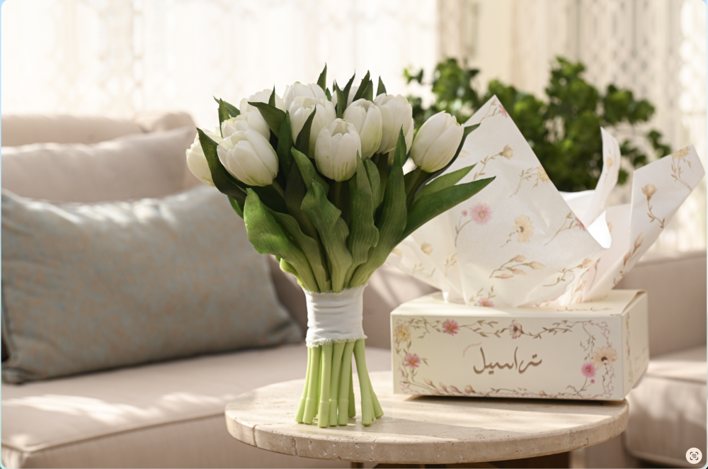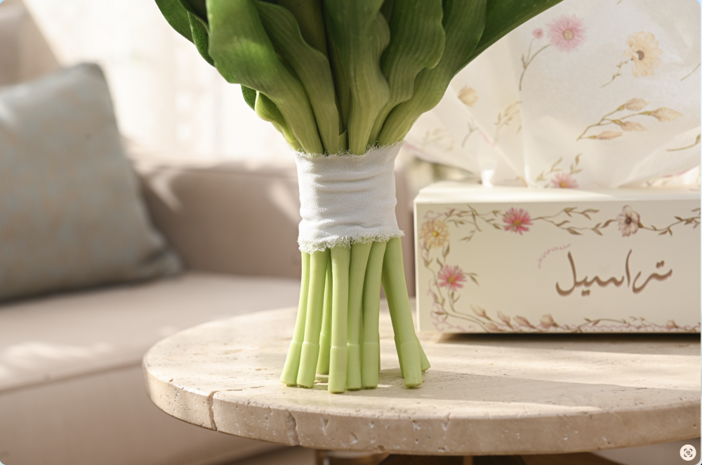 مسكة راقية مصنوعة من ورد التوليب الصناعي الفاخر بجودة عالية تشبه الطبيعي بدرجة مذهلة، بتفاصيل ناعمة وألوان هادئة تضيف لمسة أنيقة لأي مناسبة.