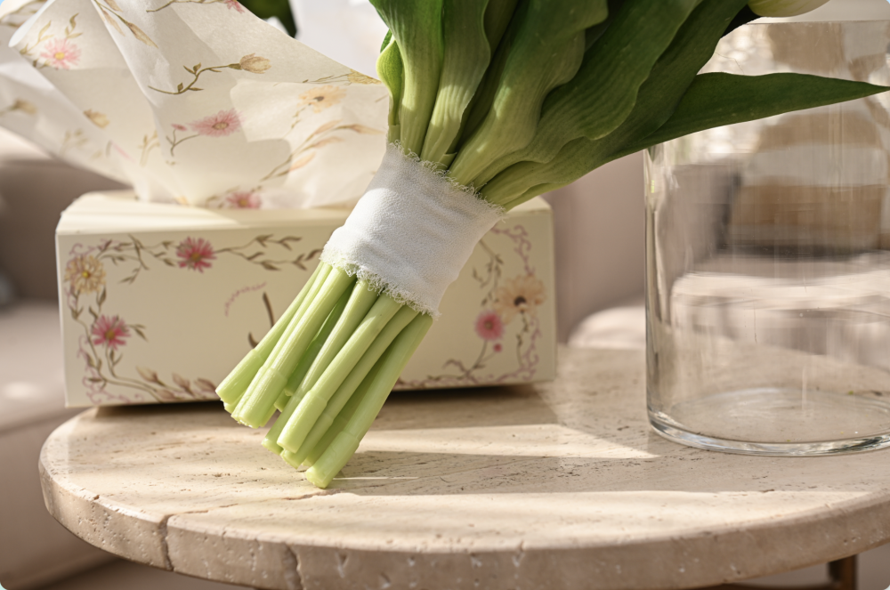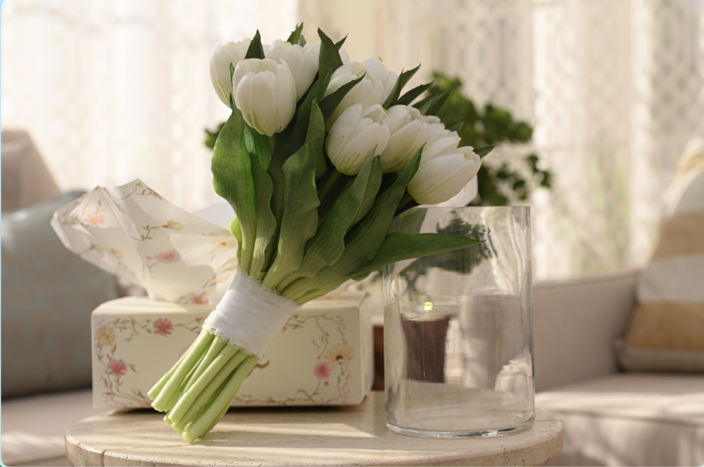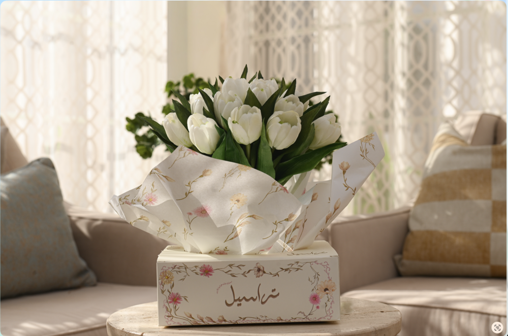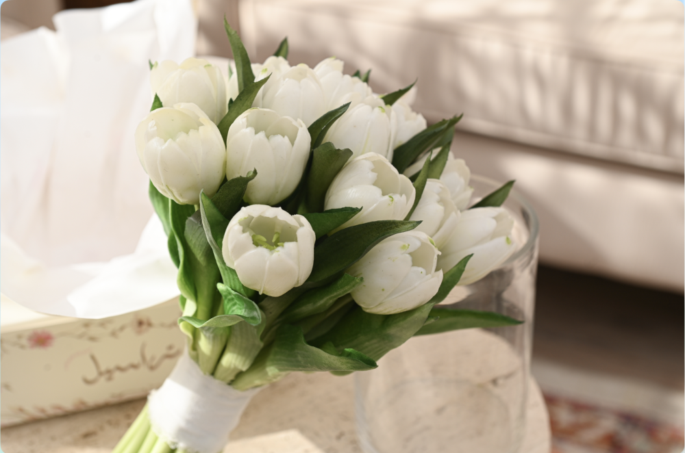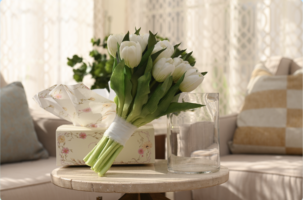 مسكة راقية مصنوعة من ورد التوليب الصناعي الفاخر بجودة عالية تشبه الطبيعي بدرجة مذهلة، بتفاصيل ناعمة وألوان هادئة تضيف لمسة أنيقة لأي مناسبة.