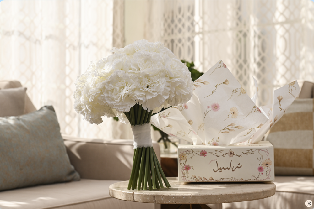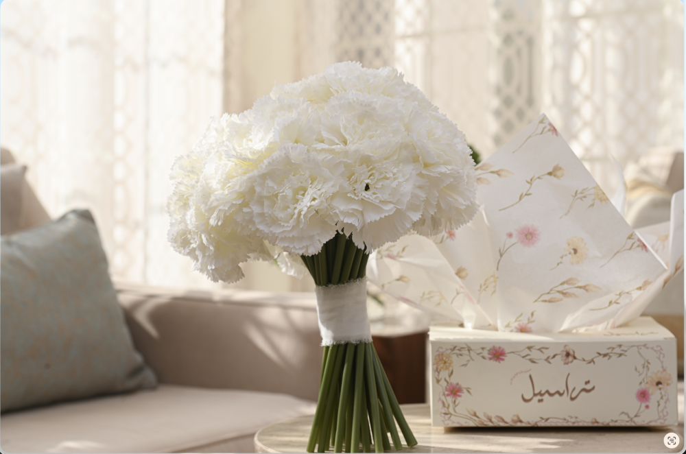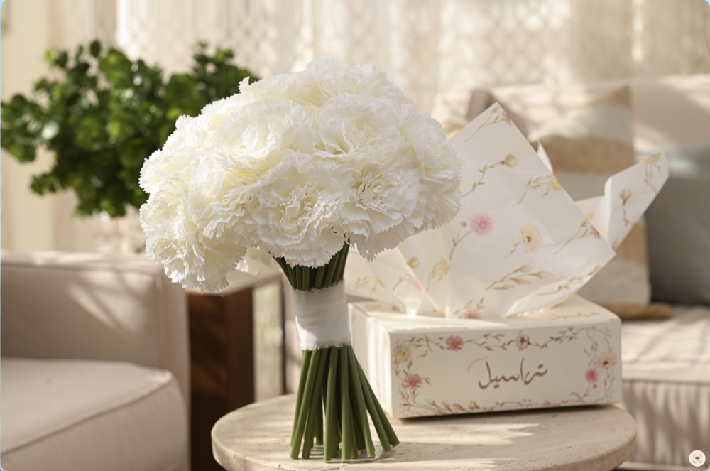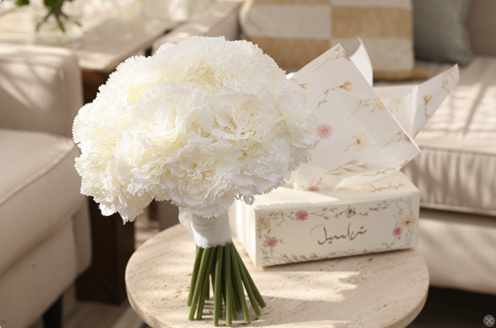 مسكة فاخرة مصنوعة من ورد الكارنيشن الصناعي الأبيض بجودة عالية وملمس واقعي يعطي إحساس الورد الطبيعي تمامًا. تنسيقها الدائري الكثيف يمنحها مظهرًا أنيقًا ومثاليًا للمناسبات.