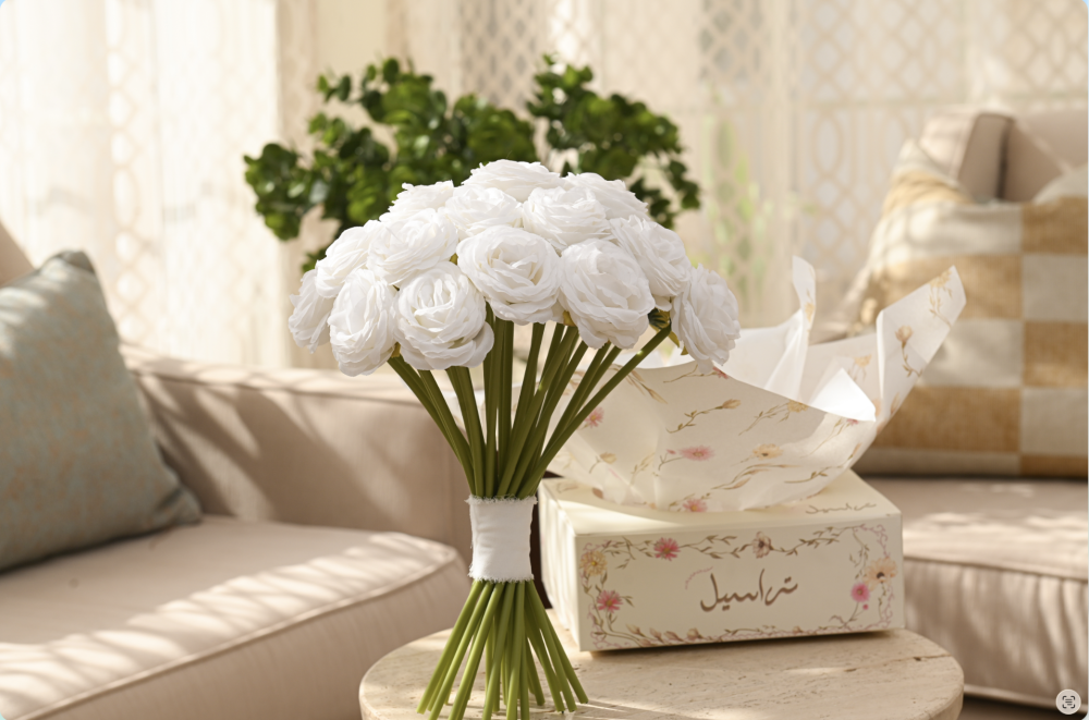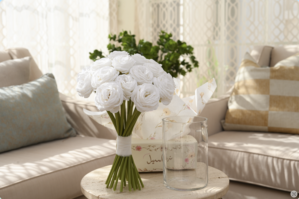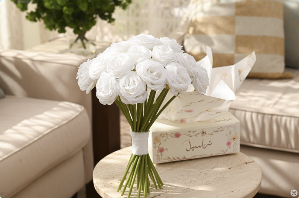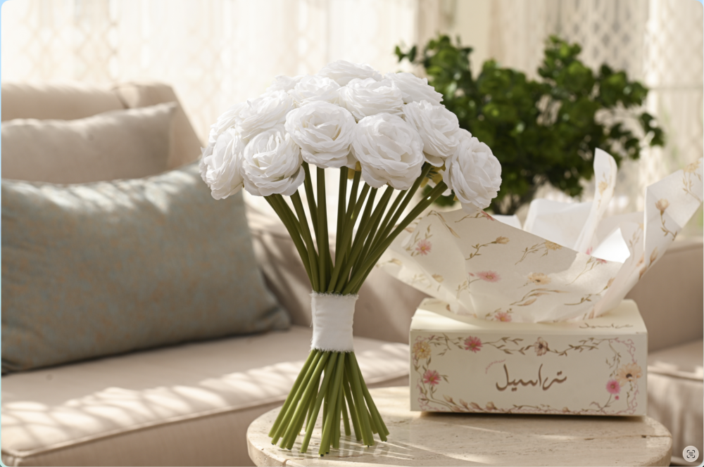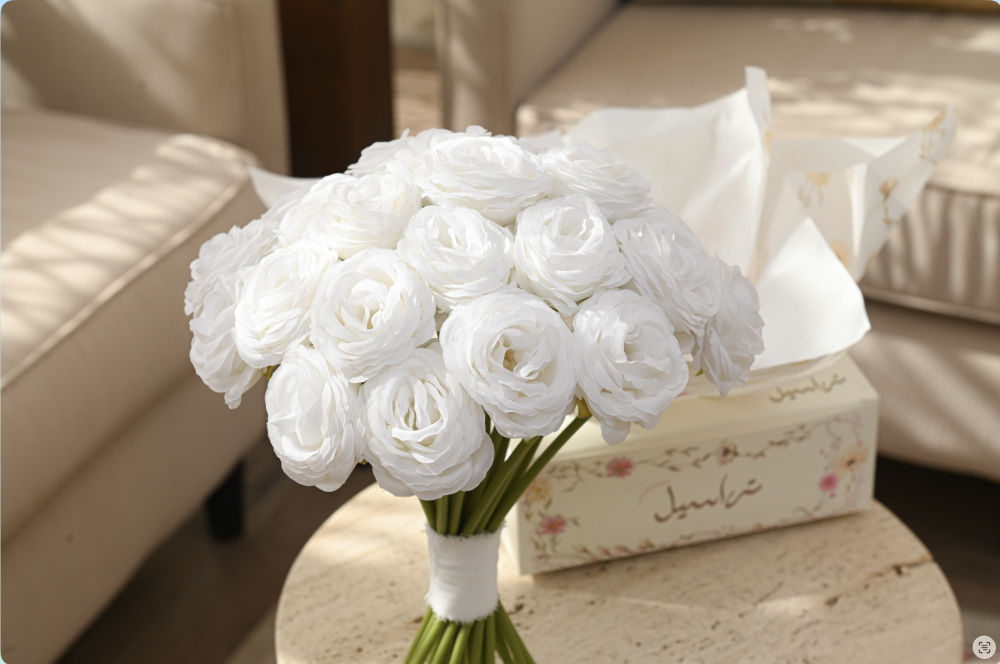 مسكة أنيقة مصنوعة من ورد الرانفكل الصناعي الأبيض بجودة عالية جدًا، بتفاصيل دقيقة وطبقات ناعمة تمنح الورد مظهرًا طبيعيًا وفخمًا في نفس الوقت. تنسيقها الدائري الكثيف يعطيها حضورًا راقيًا يليق بالمناسبات المميزة.