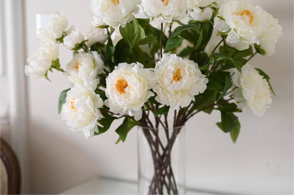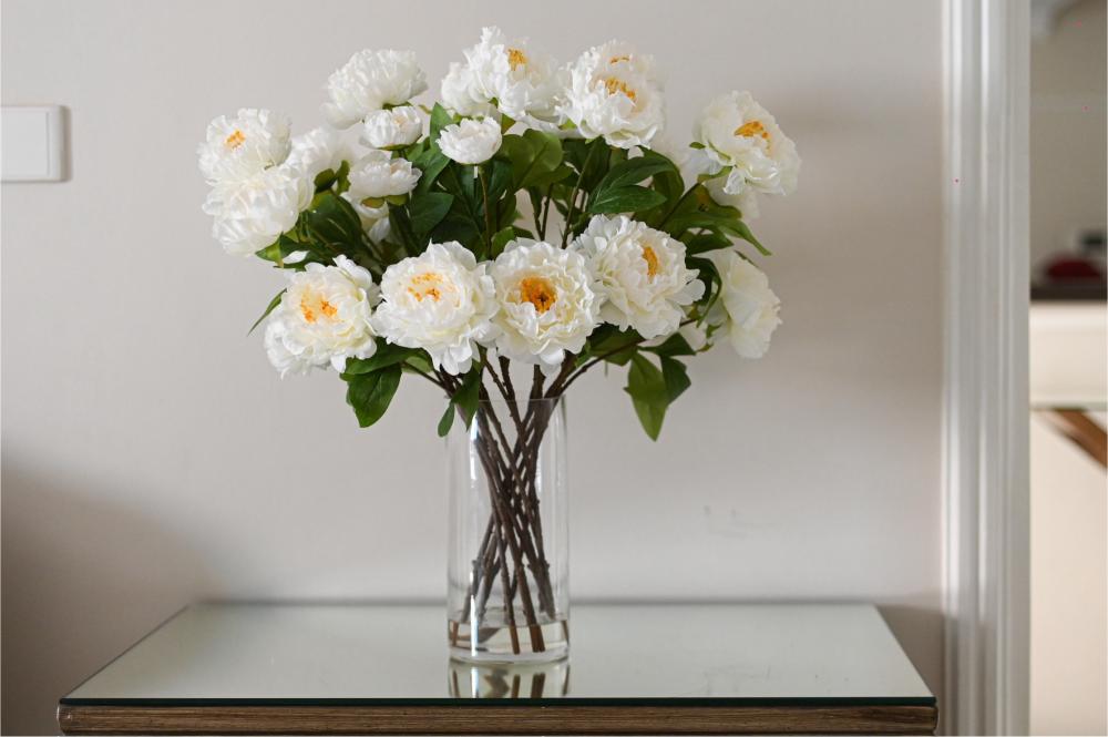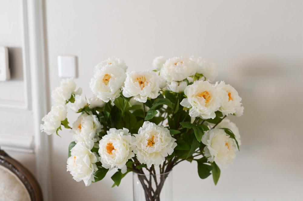 تنسيق فاخر من زهور البيوني البيضاء، يتميز ببتلاته الكثيفة والممتلئة التي تعكس إحساساً بالرقي والنعومة. لونها الأبيض مع قلب دافئ يمنح الترتيب حضوراً أنيقاً ولافتاً دون مبالغة، مما يجعله خياراً مثالياً للمساحات الراقية والديكورات الهادئة.